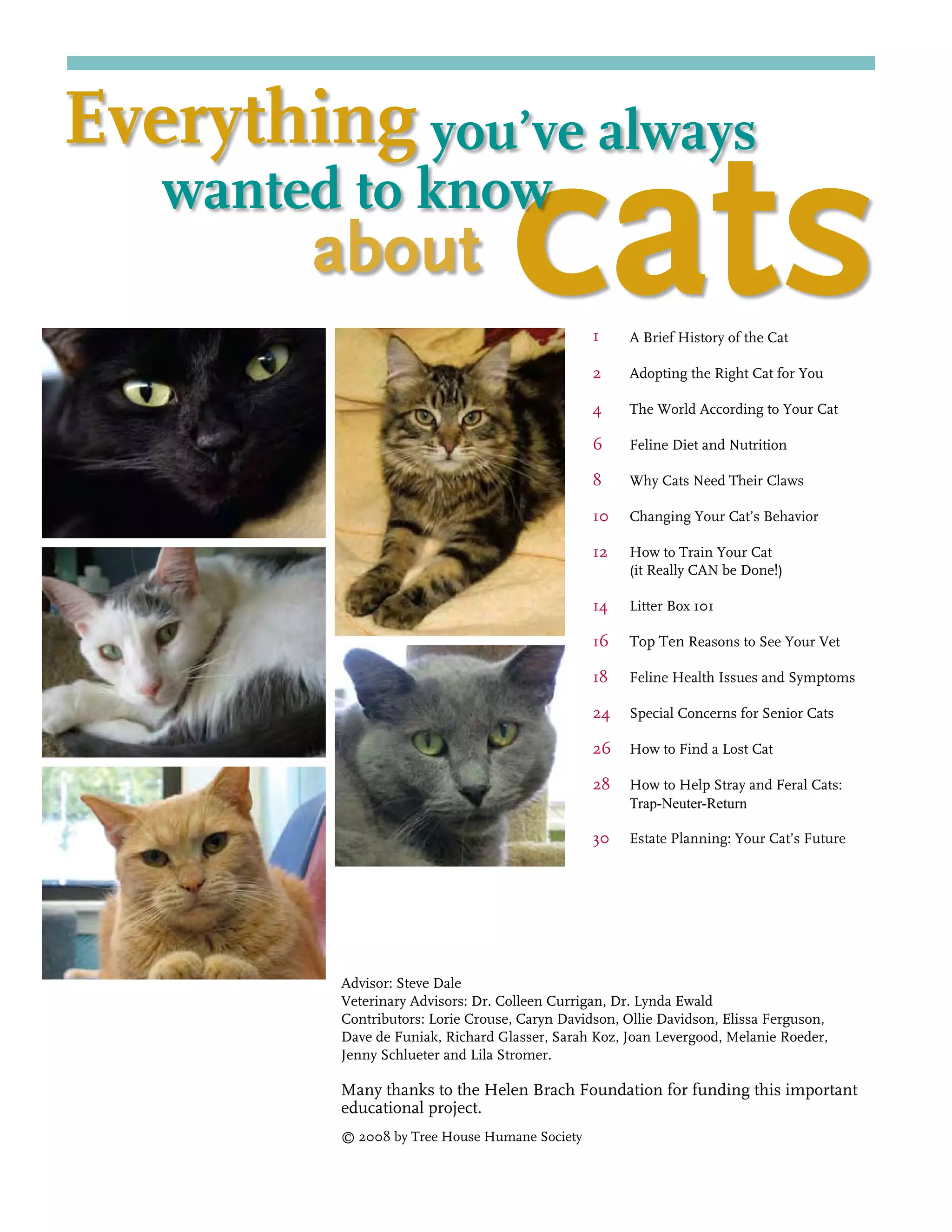 This document provides a guide to humane cat care, covering topics such as adopting the right cat, understanding feline behavior and instincts, diet and nutrition, training, health issues, and caring for stray cats. It begins with a brief history of cats' domestication in ancient Egypt and discusses how modern housecats are genetically distinct from their wild ancestors, while still being influenced by ancestral instincts. The guide emphasizes that adopting cats from shelters provides homes for animals in need and helps reduce overpopulation. It provides tips for choosing a cat that fits an adopter's lifestyle and preparing one's home, as well as gradually introducing a new cat to existing pets.