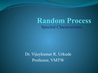 The document discusses the spectral characteristics of random processes using Fourier transforms, focusing on power density spectrum and cross power density spectrum. It provides definitions, properties, and equations for average power and spectral characteristics related to wide-sense stationary (WSS) random processes. Additionally, it presents various problems related to the derivation of autocorrelation functions and power spectral densities.