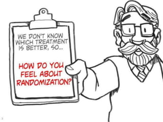 This document discusses randomization in medical research. It defines randomization as the allocation of individuals to intervention or control groups in a clinical trial by chance. Randomization avoids selection bias and balances both known and unknown confounding factors between groups. Participants, communities, or locations can be randomized. Simple, permuted block, stratified, and adaptive randomization methods are described. Threats to randomization include non-adherence to the randomization protocol and lack of treatment equipoise. Maintaining the integrity of randomization is important for establishing causality in medical research.