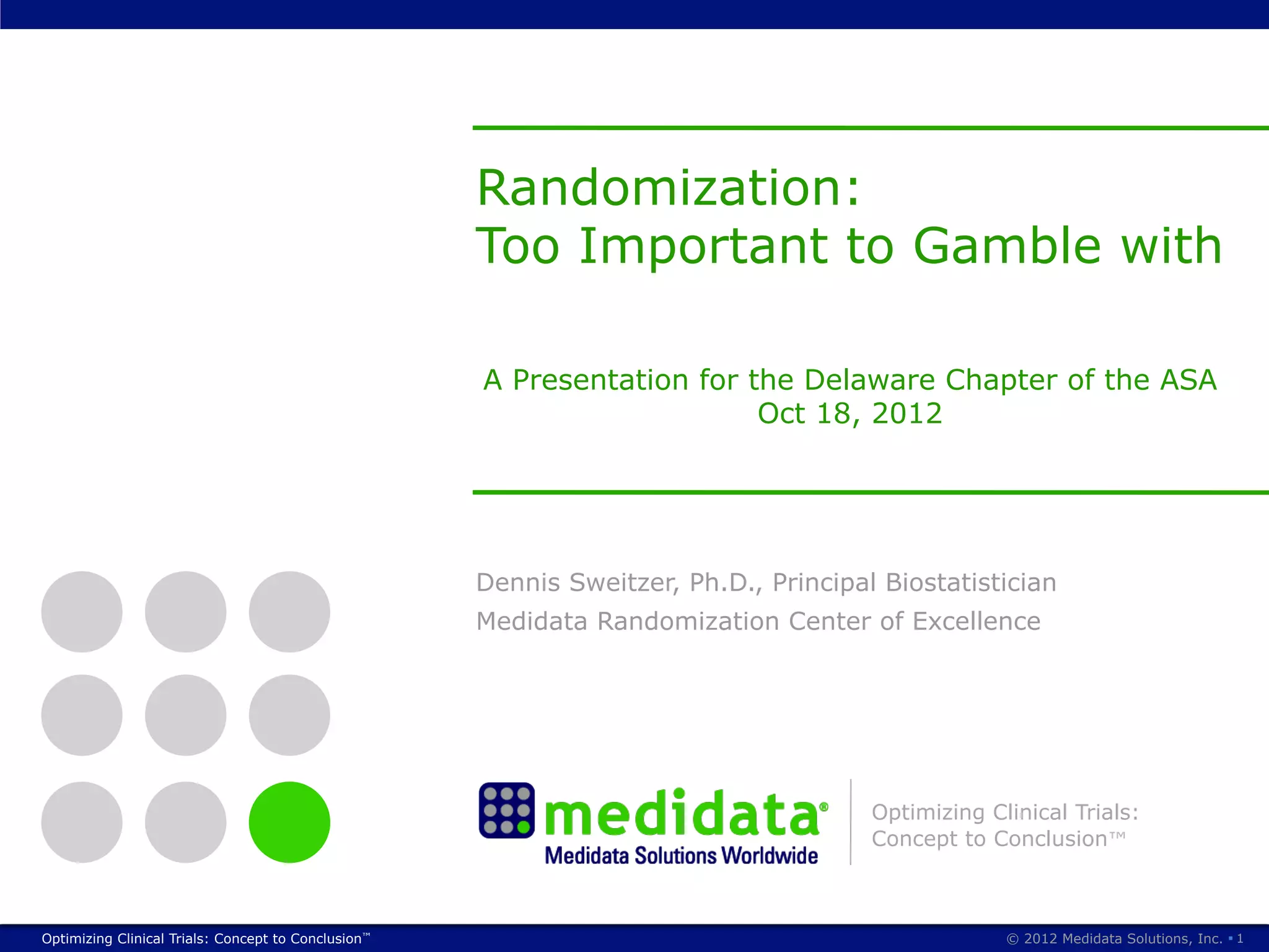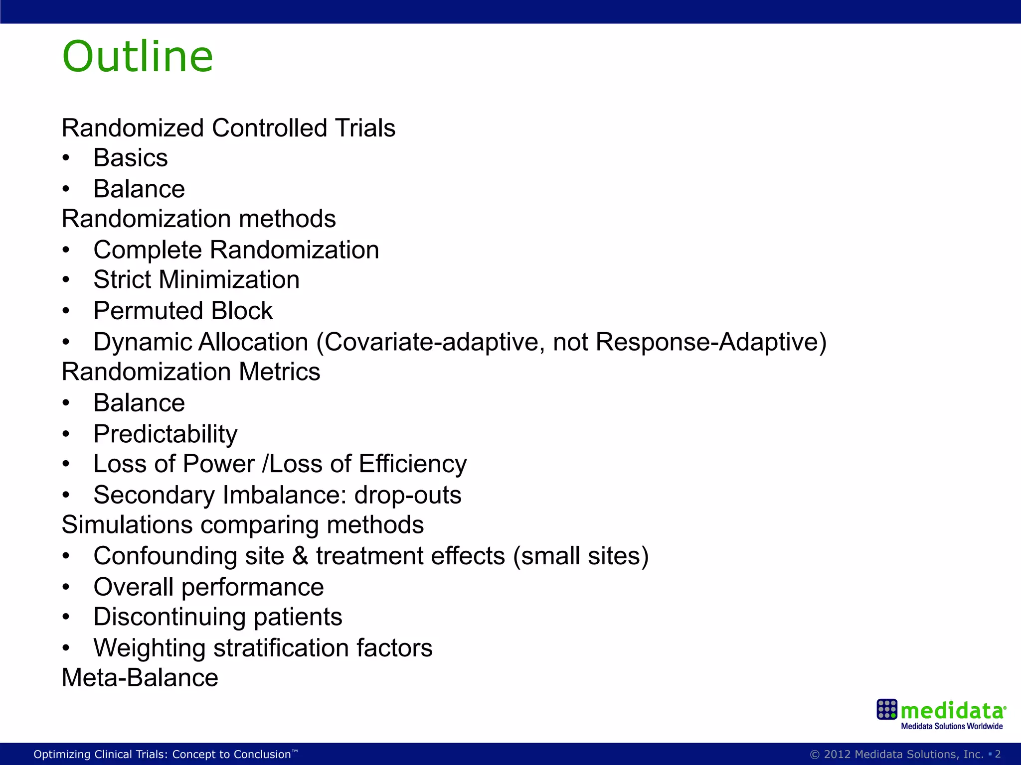 The document discusses randomization in clinical trials. It explains that randomization is important to minimize biases and balance treatment groups. Different randomization methods are presented: complete randomization, minimization, and permuted blocks. Metrics for evaluating randomization like balance, predictability, and loss of power are covered. Simulations comparing methods in terms of confounding factors, overall performance, and discontinuing patients are described. The importance of balanced treatment groups for sufficient statistical power and avoiding light weight results is emphasized.