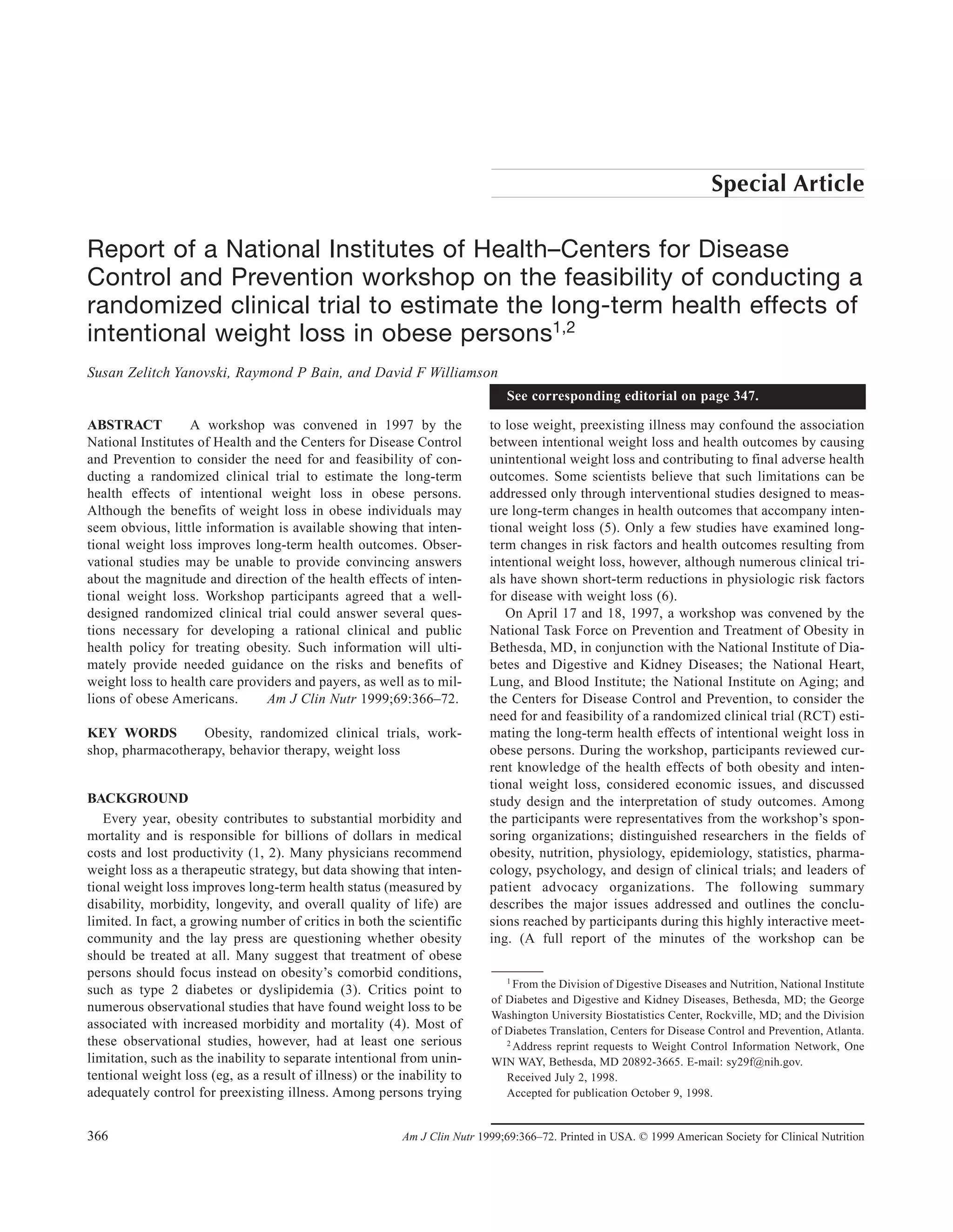 This document summarizes a workshop convened by the National Institutes of Health and Centers for Disease Control and Prevention to discuss the feasibility of conducting a randomized clinical trial to estimate the long-term health effects of intentional weight loss in obese individuals. While short-term studies show weight loss reduces disease risk factors, little is known about long-term health outcomes. Observational studies have limitations and results are inconclusive. Workshop participants agreed a well-designed randomized trial could provide clearer answers about long-term health risks and benefits of weight loss, informing clinical practice and policy.