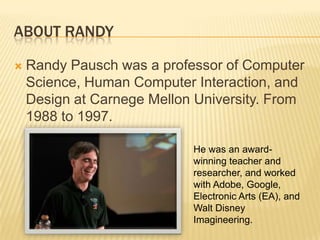 Randy Pausch was a professor of computer science who was diagnosed with pancreatic cancer. Despite receiving a terminal diagnosis, Pausch maintained a positive outlook and focused on spending time with his family and raising awareness of pancreatic cancer. He believed people cannot change difficult circumstances but can make decisions about how to face challenges with courage and pursue childhood dreams.