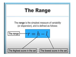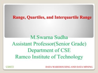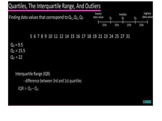 The document discusses the concepts of range, quartiles, and interquartile range (IQR) in data analysis, providing examples of calculation from a given data set. It explains how to determine the median, first quartile, and third quartile, and how the IQR is used for creating box plots and identifying outliers. Additionally, a comparison of interquartile ranges in different data sets is presented, emphasizing that a lower IQR indicates preferable data variability.