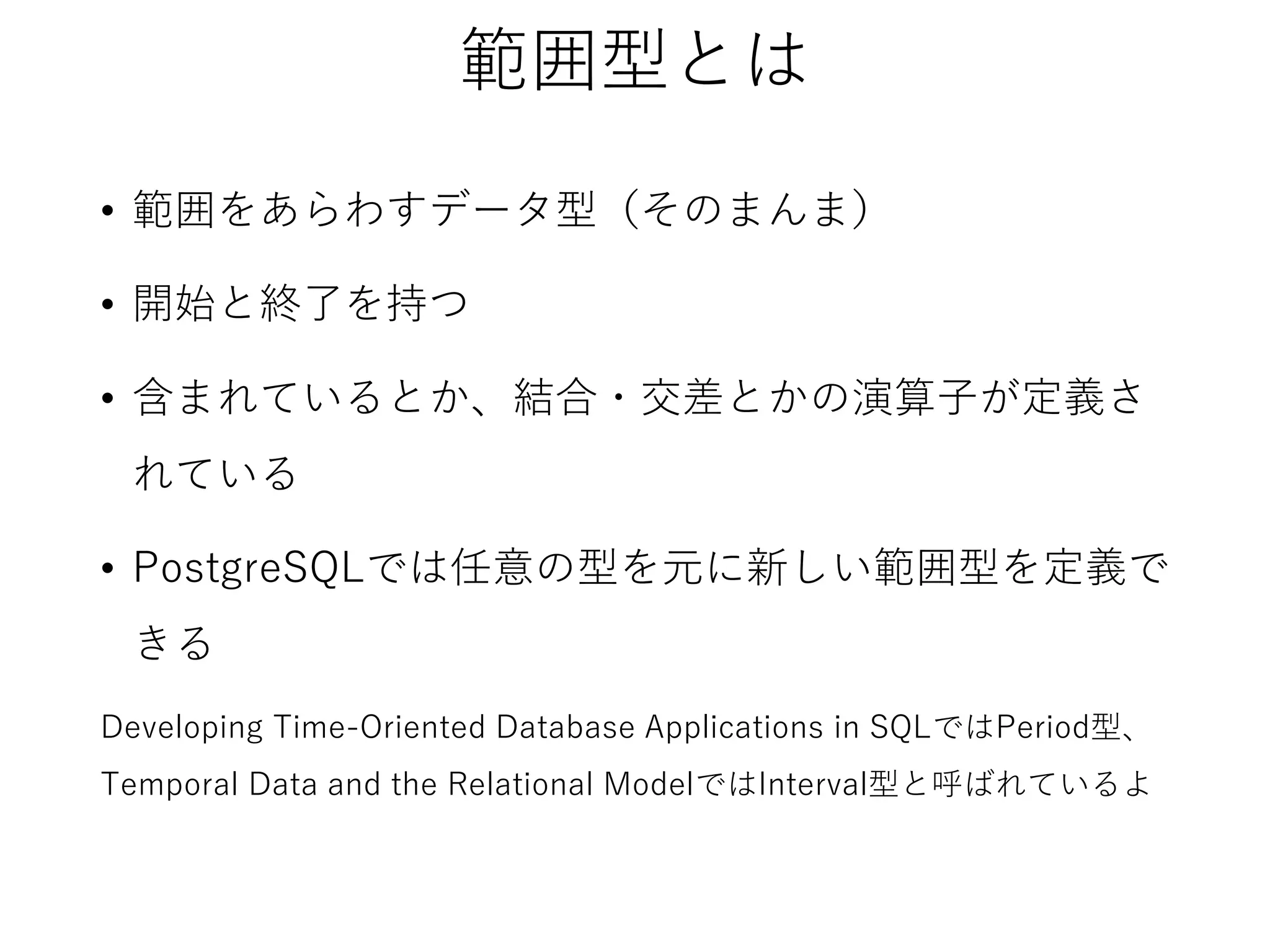 • PostgreSQLでは任意の型を元に新しい範囲型を定義で