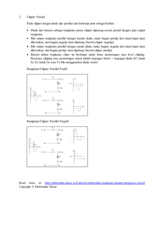 Rangkaian clipper berfungsi untuk memotong bagian sinyal masukan di atas atau di bawah level tertentu menggunakan dioda. Ada dua jenis clipper, yaitu clipper seri dan paralel, yang membedakan posisi pasangan dioda dan beban dalam rangkaian. Besaran pemotongan sinyal ditentukan oleh tegangan batrai dan dioda.