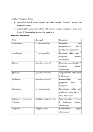 Dokumen ini membahas kemoterapi untuk pengobatan infeksi parasit, khususnya malaria yang disebabkan oleh plasmodium dan amubiasis oleh Entamoeba histolytica. Berbagai obat antimalaria dan antiamuba dijelaskan, termasuk mekanisme kerja, dosis, efek samping, dan kontraindikasi. Selain itu, terdapat informasi tentang resistensi obat dan pencegahan penularan penyakit parasit.