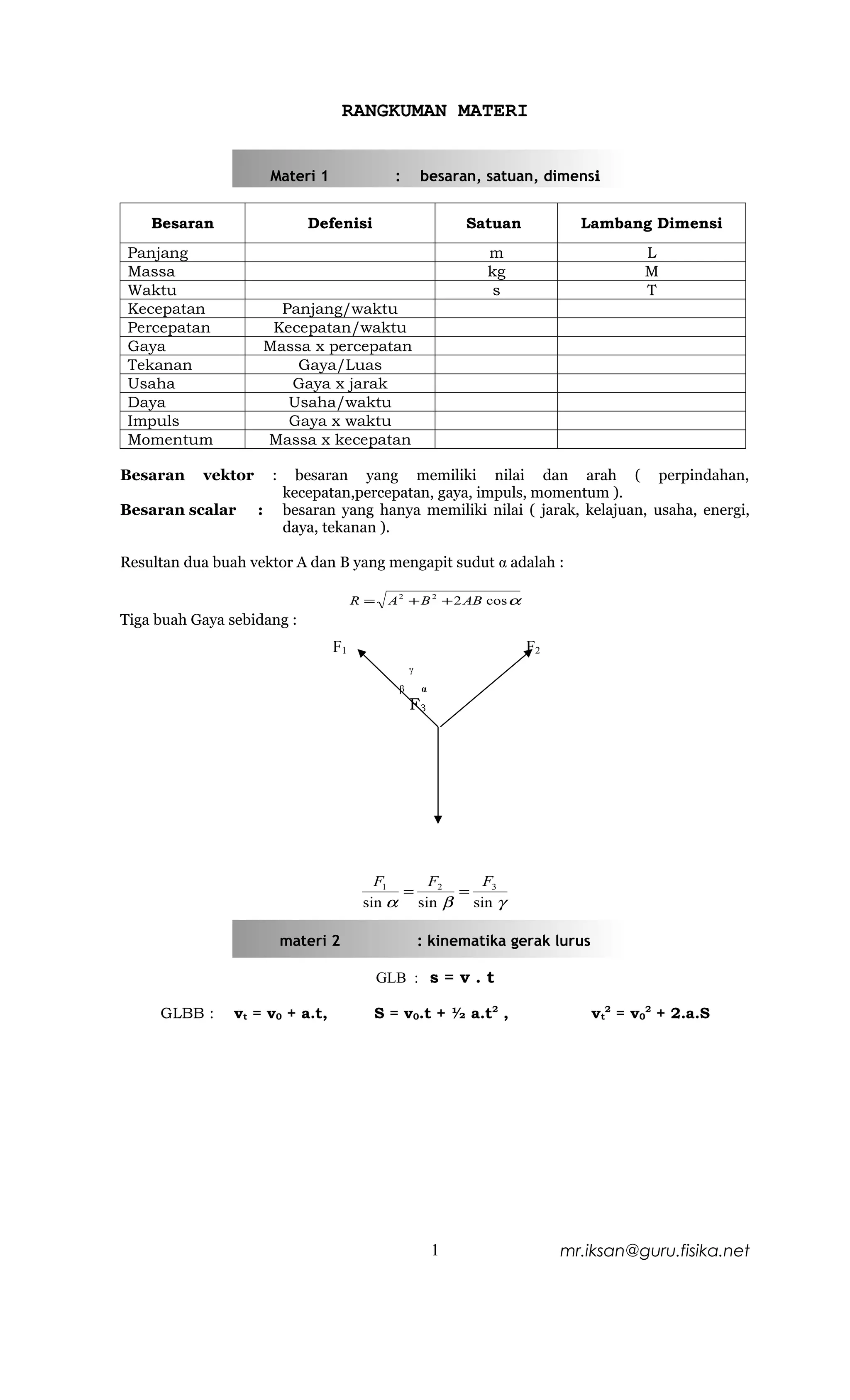 Dokumen tersebut memberikan ringkasan mengenai 17 materi fisika dasar yang mencakup besaran dan satuan, kinematika, dinamika, fluida, kalor, optik, listrik, dan magnet. Materi-materi tersebut dijelaskan beserta rumus dan konsep dasarnya.