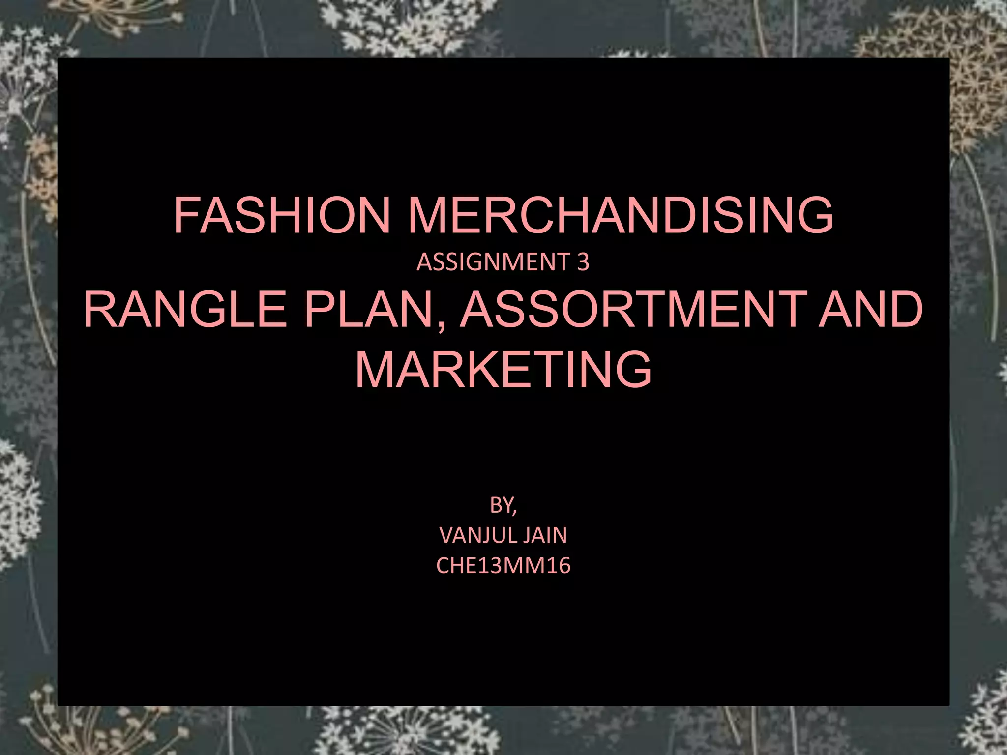 This document contains a range plan and assortment for a women's spring/summer collection with the theme of "Dandalion Day". It includes details on the colors, styles, fabrics, costs, prices, and marketing plan for various items like dresses, tops, trousers, bags, and shoes. Costing details are provided for sample items, showing fabric and production costs, profit margins, and selling prices. The target market is women ages 16-35 in India, and the products will be sold in a multibrand store with promotional activities like visual merchandising, print media, and social media.