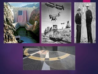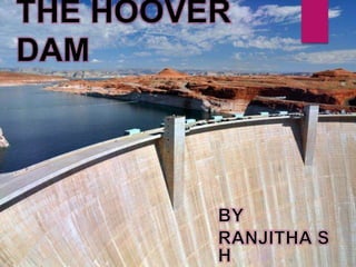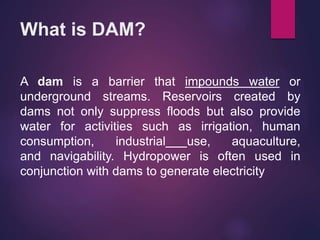 A dam is a barrier that impounds water and creates reservoirs. Dams suppress floods and provide water for uses like irrigation, power, and navigation. The Hoover Dam is a concrete arch-gravity dam on the Colorado River between Nevada and Arizona. It was constructed between 1931-1936 to control floods and generate hydroelectric power. Over 4 million cubic yards of concrete were used to build the dam, which stands 726 feet tall and created Lake Mead. The dam continues to provide flood control and power to millions in the Southwest United States.