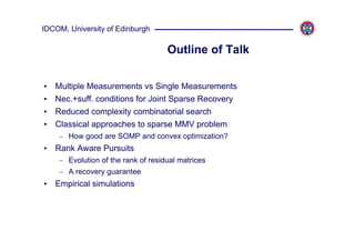 This document discusses rank-aware algorithms for joint sparse recovery from multiple measurement vectors (MMV). It begins by introducing the MMV problem and showing that when the rank of the signal matrix is r, the necessary and sufficient conditions for unique recovery are less restrictive than in the single measurement vector case. Classical MMV algorithms like SOMP and l1/lq minimization are not rank-aware. The document then proposes two rank-aware pursuit algorithms: