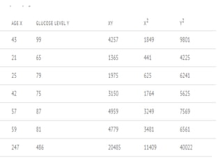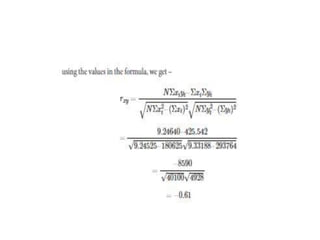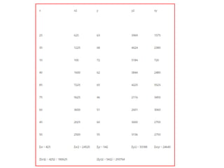 The document provides statistical calculations for a data set with 6 samples. It lists the sums of x, y, xy, x^2 and y^2 as well as the result of dividing 2868 by 5413.27 which equals 0.529809.