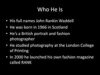 John Rankin Waddell is a British portrait and fashion photographer born in 1966 in Scotland. He studied photography at the London College of Printing and launched his own fashion magazine called RANK in 2000. This document provides details about Rankin and examples of portraits he has taken of celebrities such as Pete Doherty, Jarvis Cocker, Jimmy Carr, The White Stripes, and Keith Richards.