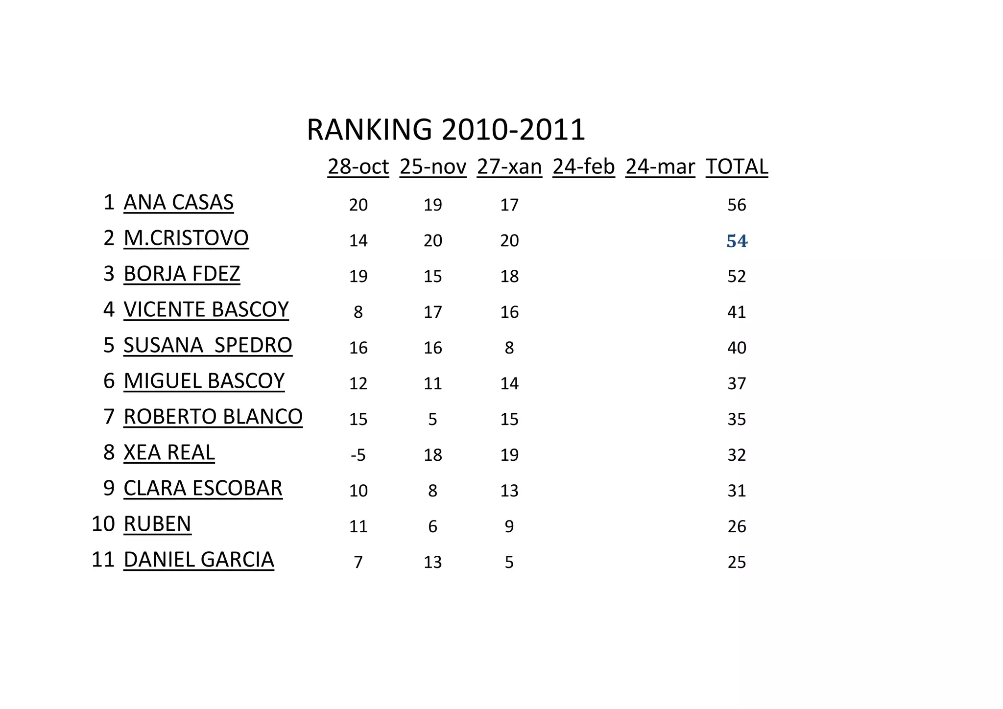 28-oct 25-nov 27-xan 24-feb 24-mar TOTAL 1 ANA CASAS 20 19 17 56 2 M.CRISTOVO 14 20 20 54 3 BORJA FDEZ 19 15 18 52 4 VICENTE BASCOY 8 17 16 41 5 SUSANA SPEDRO 16 16 8 40 6 MIGUEL BASCOY 12 11 14 37 7 ROBERTO BLANCO 15 5 15 35 8 XEA REAL -5 18 19 32 9 CLARA ESCOBAR 10 8 13 31 10 RUBEN 11 6 9 26 11 DANIEL GARCIA 7 13 5 25
