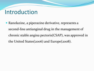 Ranolazine is a second-line antianginal drug that inhibits late inward sodium currents, reducing calcium overload and improving myocardial perfusion. It has shown efficacy in reducing angina in clinical trials. Ranolazine also partially inhibits fatty acid oxidation, shifting metabolism from fatty acids to glucose. Common side effects include dizziness and constipation. It has potential utility for various conditions including microvascular coronary disease and post-operative atrial fibrillation, though evidence is limited for others such as acute coronary syndrome.
