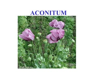 Aconitum, also known as Monkshood or Aconite root, contains toxic alkaloids including aconitine. It grows in mountains and is used as a local analgesic, anti-inflammatory, and antipyretic in small doses, but can be fatal in higher amounts. Hydrastis canadensis or Golden seal contains alkaloids like berberine and hydrastine and is used as an astringent. Delphinium contains alkaloid toxins and is used as a parasiticidal and treatment