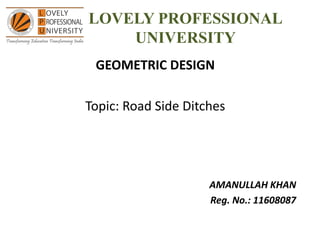 This document discusses the design of road side ditches. It describes different types of ditch cross-sections including triangular, parabolic, and trapezoidal. The trapezoidal section is most commonly used as it is acceptable from both hydraulic and construction perspectives. The document provides guidelines for side slopes, minimum widths and depths. It also discusses different types of ditch linings like turfing, concrete, and brick that are used depending on site conditions and flow velocities. Finally, it provides steps for designing a ditch for a given discharge and slope using Manning's equation.