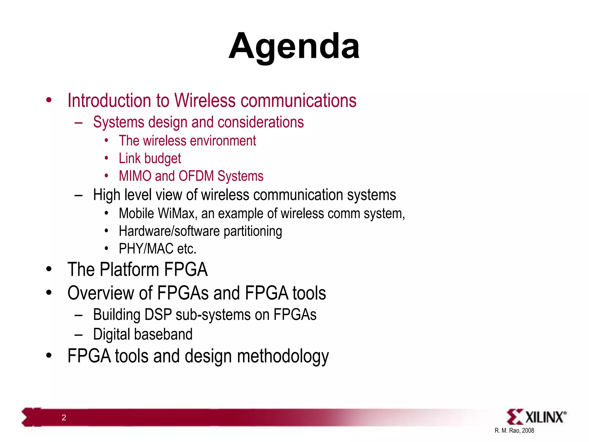 This document provides an overview of wireless communications and mobile WiMax systems. It discusses key topics like the wireless environment, link budgets, MIMO and OFDM techniques, and hardware/software partitioning in wireless systems. It also introduces FPGAs and their role in building DSP subsystems for digital baseband processing in wireless applications. Mobile WiMax is presented as an example wireless communication system that utilizes many of these technologies.