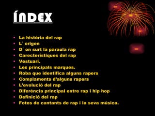 ÍNDEX La històriadel rap L´ origen D´ on surt la paraula rap Carecterístiques del rap Vestuari. Les principals marques. Roba que identifica alguns rapers Complaments d’alguns rapers L’evolució del rap Diferéncia principal entre rap i hip hop Definició del rap Fotos de cantants de rap i la seva música.