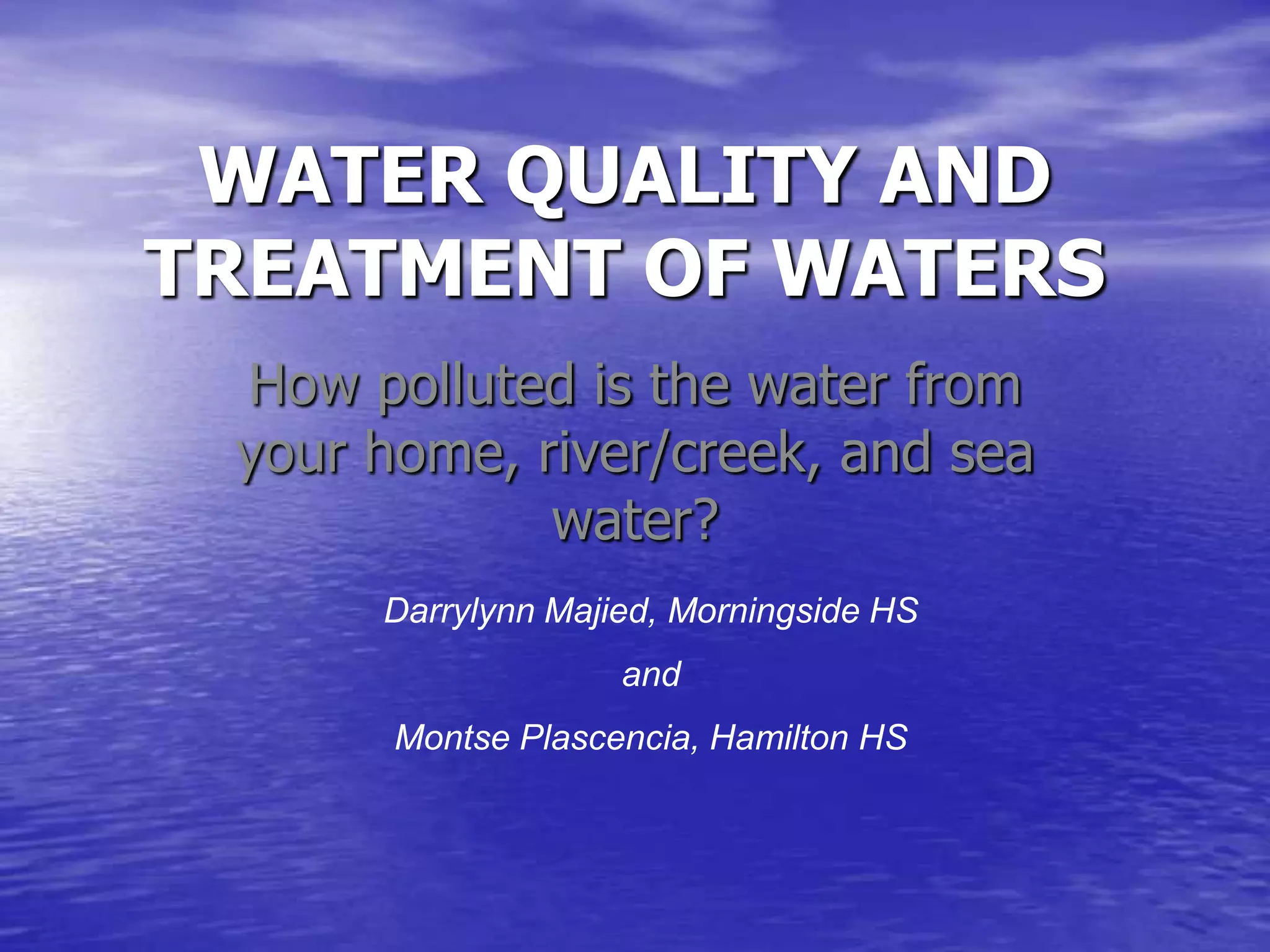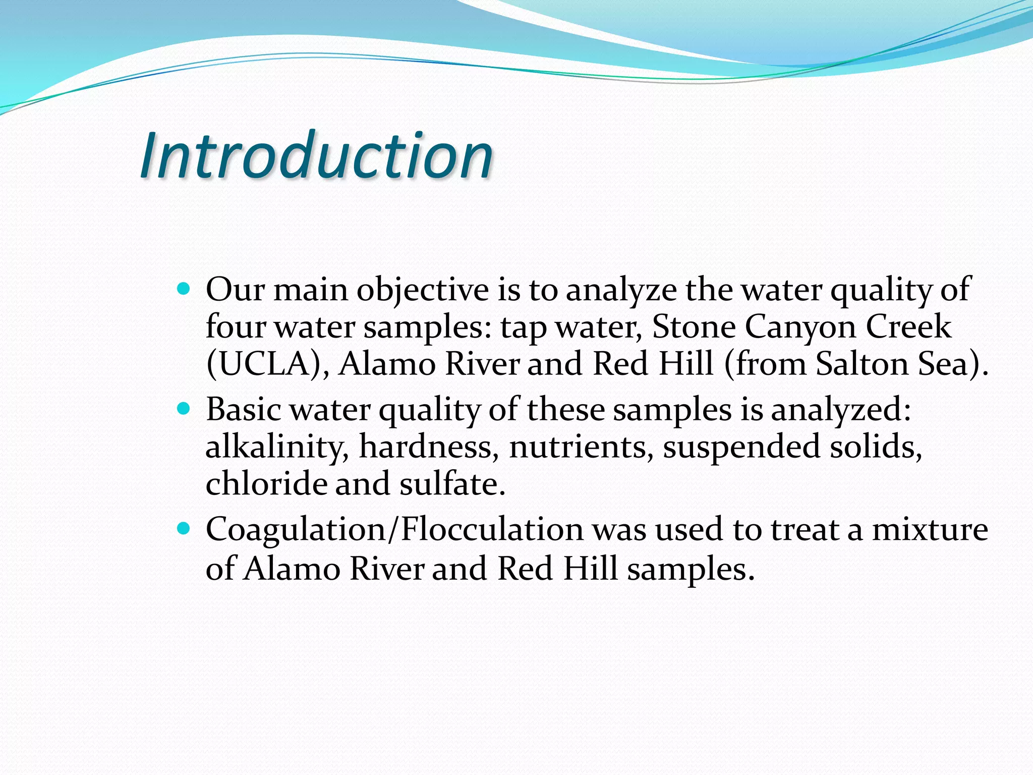 The document analyzes and compares the water quality of four water samples - tap water, Stone Canyon Creek, Alamo River, and Red Hill from the Salton Sea. Key findings include: Alamo River and Red Hill have much higher levels of alkalinity, hardness, nutrients, suspended solids, chloride and sulfate compared to tap water and creek water. A coagulation/flocculation treatment using aluminum sulfate was able to significantly reduce turbidity in a mixture of Alamo River and Red Hill water. The water quality of Alamo River and Red Hill need urgent improvement to meet EPA standards.