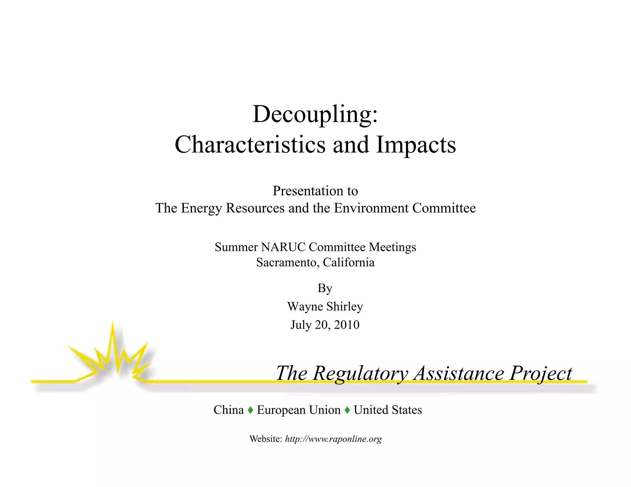 The presentation discusses revenue decoupling in the energy sector, focusing on its mechanisms and effects on pricing and revenue recovery. It contrasts traditional regulation with decoupling, indicating how decoupling leads to stable revenues despite fluctuating sales. The document also explores case studies and scenarios related to demand-side reductions and their financial impacts.