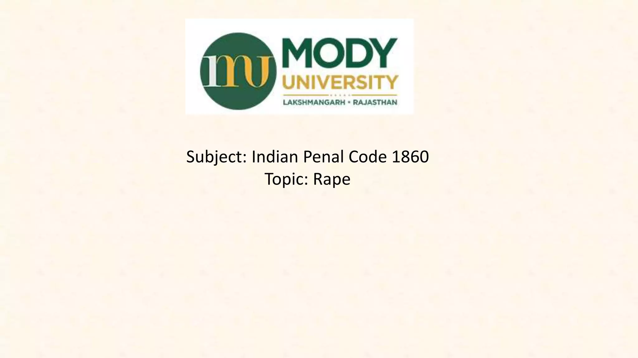 The document discusses rape under Indian law. It defines rape and the different types of rape offenses covered such as custodial rape, gang rape, marital rape, and rape of minors. It outlines the sections of the Indian Penal Code that define and prescribe punishment for rape and related crimes. It also summarizes some prominent court cases related to rape that helped shape interpretations of the law, such as the Mathura rape case, the 2012 Delhi gang rape case, and the Aruna Shanbaug case.