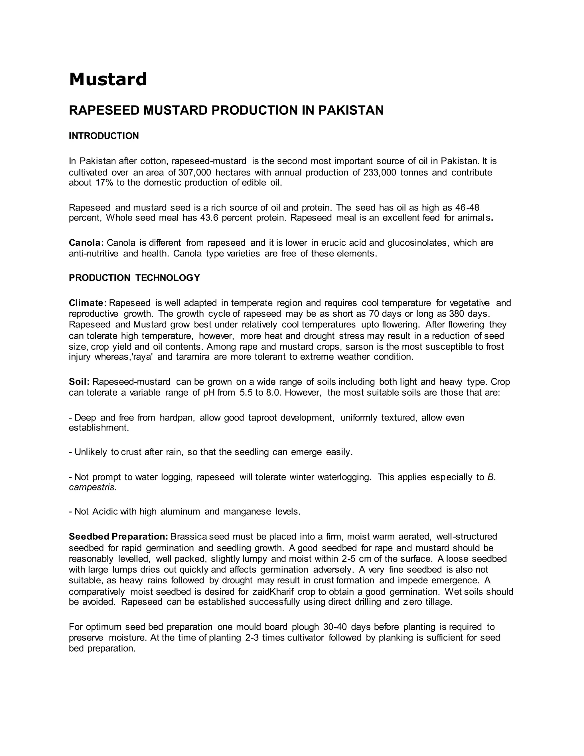 Rapeseed-mustard is the second most important oil crop in Pakistan, grown on 307,000 hectares annually producing 233,000 tonnes. It is a rich source of oil and protein. Canola varieties have been developed that are lower in anti-nutritive compounds. Rapeseed grows best in temperate regions under cool temperatures and requires 3-4 irrigations. Key pests that can damage establishment include red-legged earth mites and blue oat mites, while cabbage aphids and turnip aphids threaten crops during flowering and pod formation.