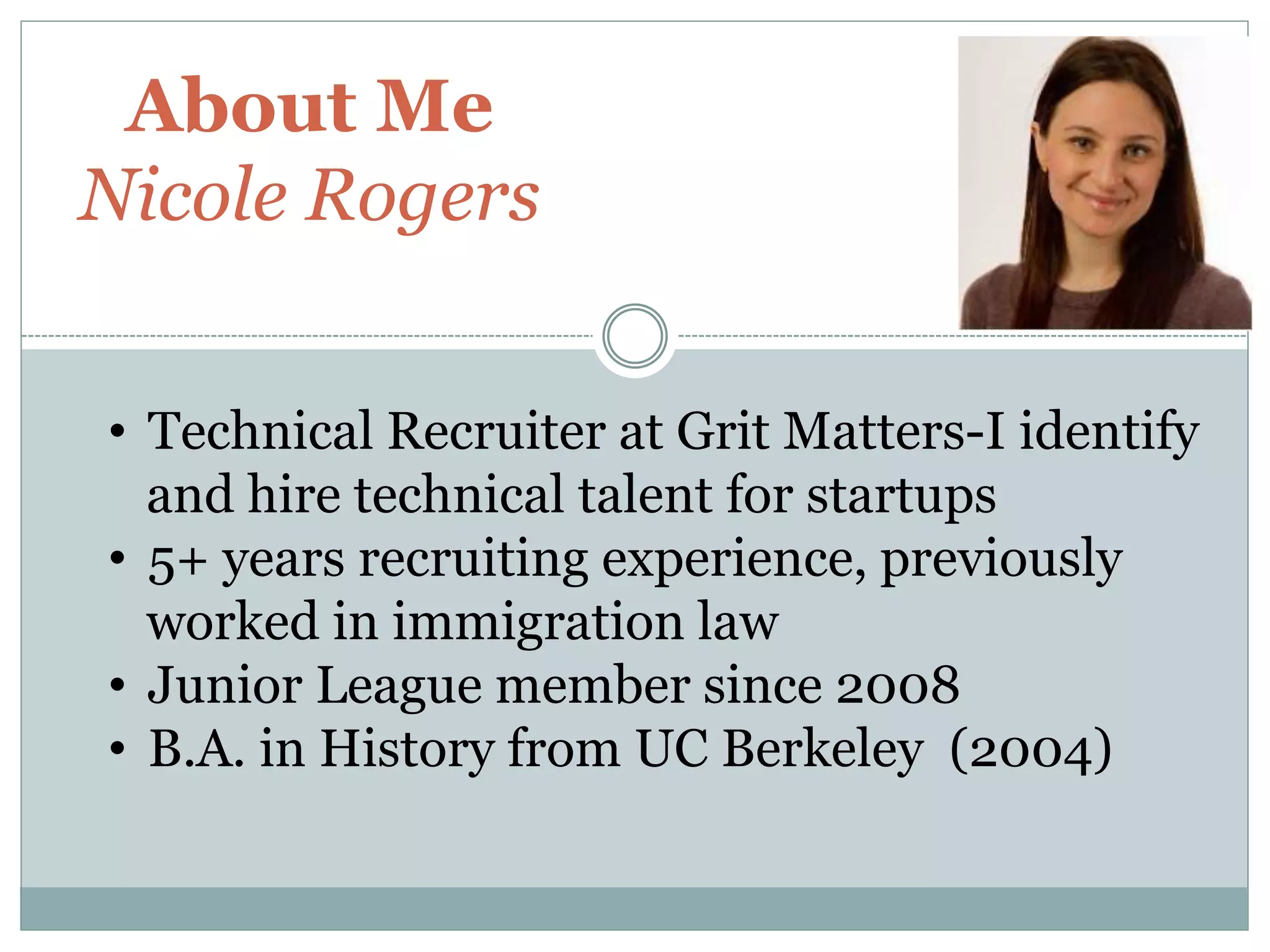 The document provides tips for resume writing, job searching, and what employers want in employees from Nicole Rogers, a technical recruiter at Grit Matters. She recommends keeping resumes to one page and quantifying accomplishments. For job searching, networking through contacts and attending events is key. Employers want proactive employees who are detail-oriented, flexible, and represent the company's brand and values well.
