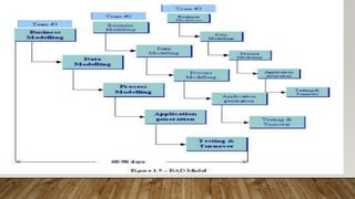 The Rapid Application Development (RAD) model is an incremental software development approach where components are developed in parallel like mini-projects. It focuses on quickly delivering a working prototype to users for early feedback. The RAD process involves requirements planning, user design, construction, and cutover stages. It is best for modularized systems that need to be created quickly within 2-3 months when high-skilled designers and adequate budget are available for modeling and code generation. Key benefits are reduced time-to-market and early user reviews, while high dependency on modeling skills is a disadvantage.