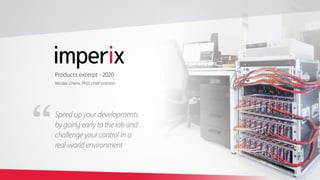 This document summarizes products from Imperix, including a rapid prototyping controller, power modules, and software. The controller allows automated code generation from Simulink or C/C++ and has protections and stackable construction. The software includes blockset support for Simulink/PLECS and monitoring software. Customers include those in 29 countries with 3.7 MW of power installed worldwide.
