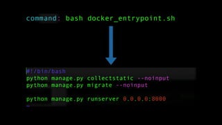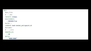 The document outlines the workflow requirements and objectives for deploying a full stack Django REST framework application using Docker Compose, including components like Nginx, PostgreSQL, and Redis. It provides guidance on Docker commands, container lifecycle management, scaling, and application configuration through environment variables. It emphasizes the importance of minimal setup and the ability to iterate on code quickly across various operating systems.