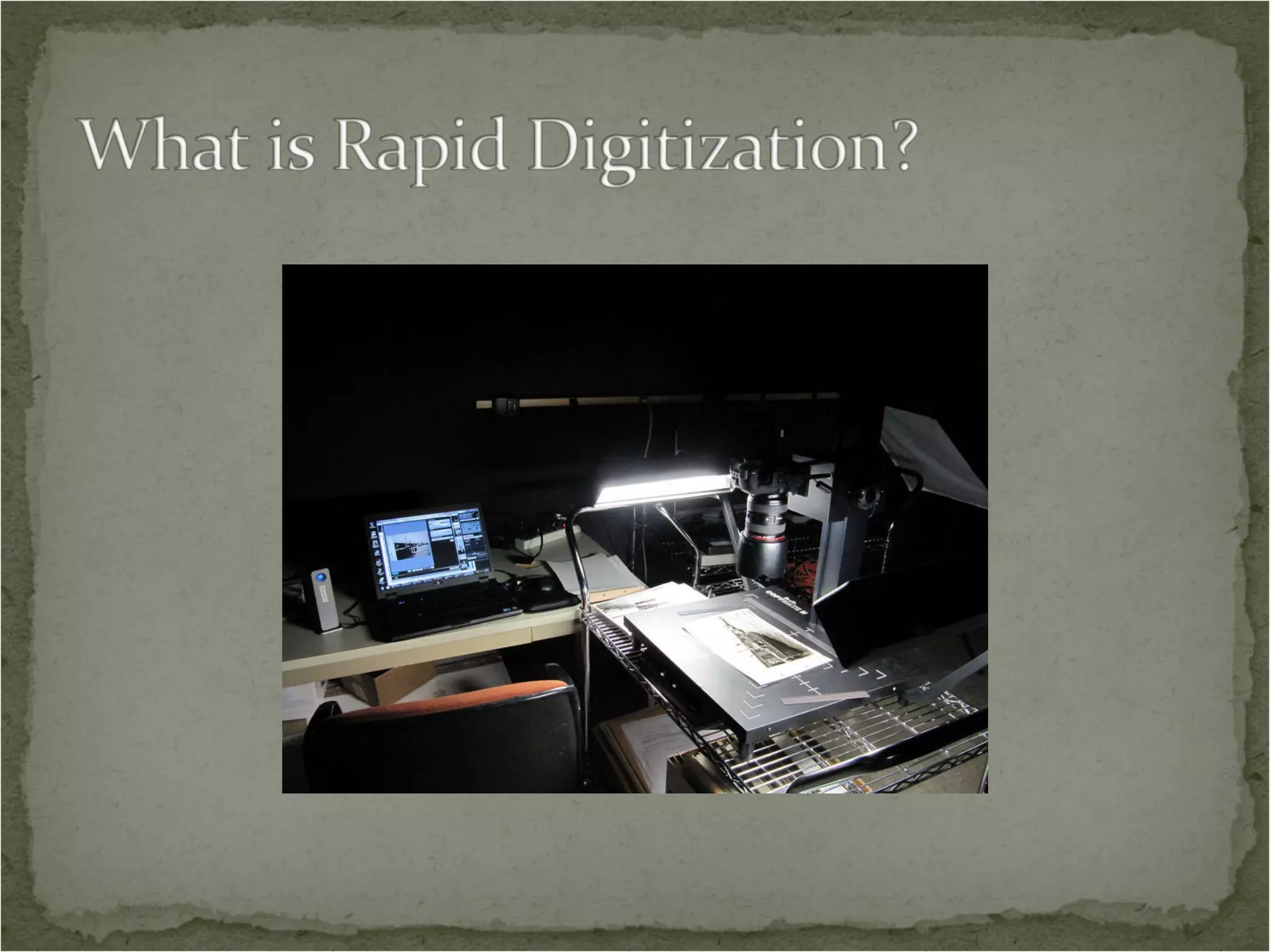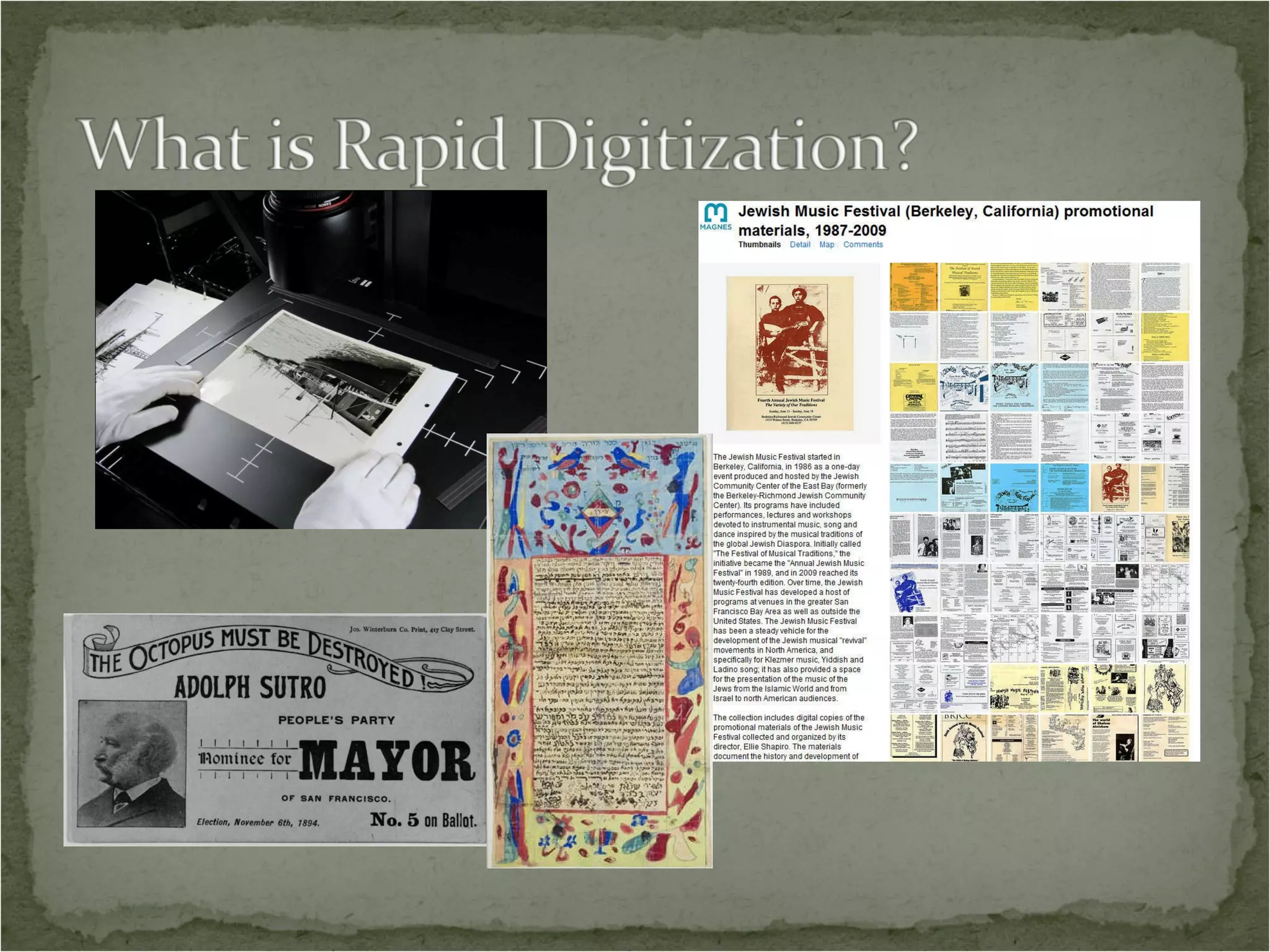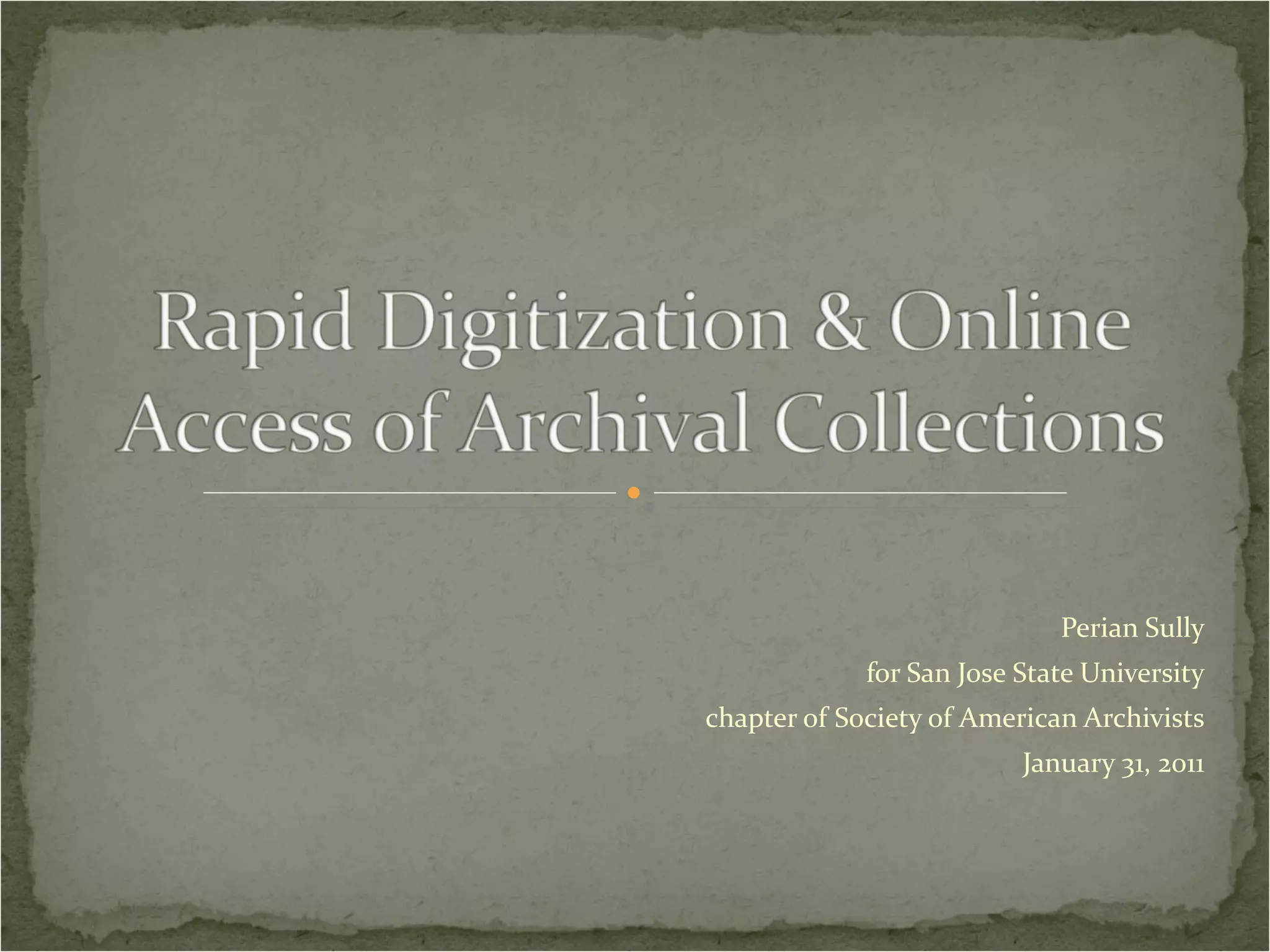 The document discusses an efficient method for digitizing collections, particularly for institutions like San Jose State University, using digital SLR cameras. This approach can produce high-quality images at a low setup cost and allows for the rapid accessibility of materials, helping with preservation and public engagement. However, it also outlines challenges such as potential loss of images, infrastructure costs, and copyright issues.