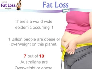 The document discusses a rapid fat loss program. It notes that obesity is a global epidemic, affecting over 1 billion people worldwide. It argues that modern lifestyles and food environments have made weight gain challenging, as portion sizes are large, processed foods are common, and exercise and sleep are lacking. The program aims to fix metabolism and control appetite, calories, and energy through metabolism correction drops, low calorie diets, thermogenic supplements, and detox methods. It claims the program can help people lose 10kg or more in 3 weeks while saving money on their food bill.