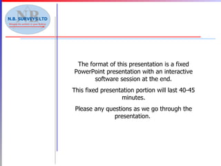 NB Surveys Ltd, established in 1982, provides surveying services to the oil and gas industries globally, utilizing advanced technologies like laser scanning and digital photogrammetry. They offer a range of deliverables including topographic, hydrographic, and building surveys, with a focus on accurate dimensional control and visualization through proprietary software. The presentation includes interactive elements and showcases their capabilities, equipment, and customer applications in both onshore and offshore environments.