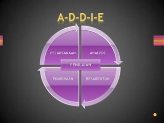 Dokumen ini membincangkan penggunaan model ADDIE dalam reka bentuk dan teknologi pengajaran yang membolehkan proses pengajaran direka secara sistematik. Ia menekankan pengurangan masa dan kos melalui pendekatan bukan linear yang membolehkan maklumbalas pengguna dan pengujian awal produk. Selain itu, ia juga menerangkan manfaat integrasi pengguna dalam proses reka bentuk dan keperluan untuk komunikasi yang berkesan.