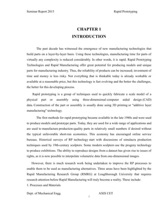 1. Rapid prototyping is a group of techniques that quickly fabricate a scale model of a physical part using 3D computer-aided design data through additive layer manufacturing. 2. The document discusses the history and development of rapid prototyping technologies from the 1980s onward. 3. It describes common rapid prototyping processes like stereolithography, selective laser sintering, and fused deposition modeling which build parts layer-by-layer from materials in different states of matter.