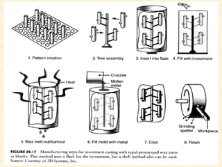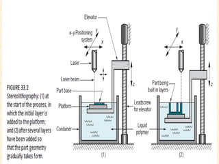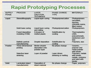 Rapid prototyping and tooling techniques allow for the quick fabrication of prototypes and tools with minimal lead time based on CAD models. Stereolithography is one of the earliest techniques and works by curing liquid photopolymer resin layer-by-layer with a laser. Multijet modeling is similar but uses inkjet print heads to deposit photopolymer layers. Selective laser sintering works by using a laser to sinter powder materials layer-by-layer. Fused deposition modeling extrudes thermoplastic filaments layer-by-layer. Together these additive techniques provide fast and flexible options for prototyping and manufacturing.