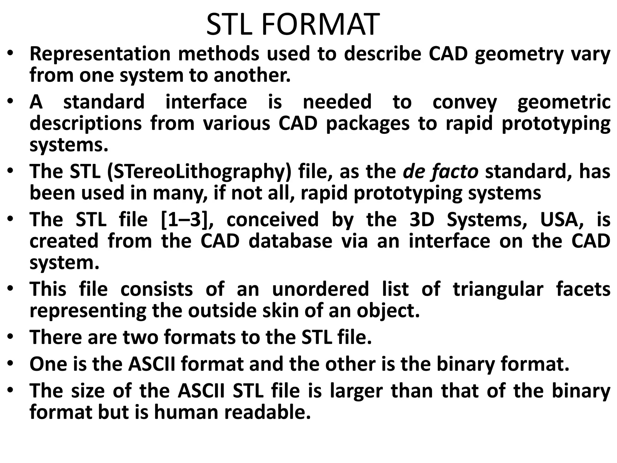The document discusses several file formats used for rapid prototyping, including STL, IGES, HP/GL, CT, SLC, CLI, and RPI. The STL format is the most common standard but has limitations as it only describes triangular facets and not topology. Other formats such as IGES carry more precise geometry information but also redundant data. SLC and CLI aim to represent layered information more directly from CAD models to address STL limitations. RPI maintains topological information in addition to facet geometry.