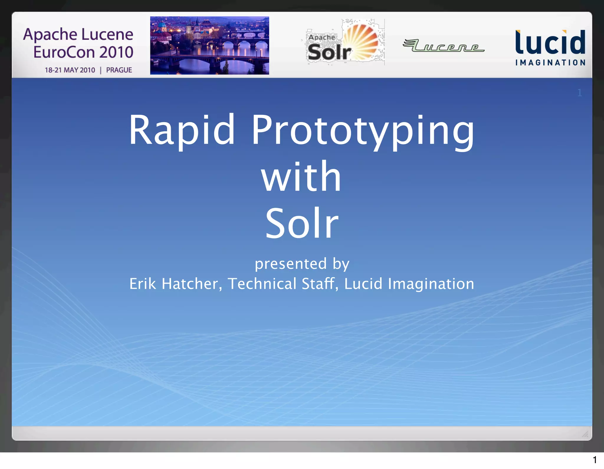 The presentation by Erik Hatcher discusses rapid prototyping with Solr to make data searchable, highlighting the importance of adjusting Solr's schema and showcasing data in a flexible user interface. It emphasizes demonstrating Solr's capabilities, provides various methods for data import, and covers techniques for customizing request handlers and UI treatments. Additionally, it outlines next steps for refining and integrating the Solr application before deployment.