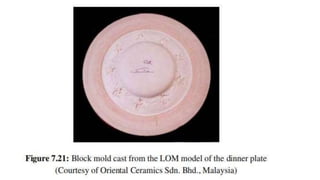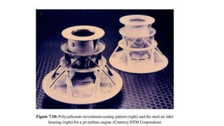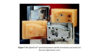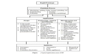 This document discusses several applications of rapid prototyping (RP) including applications in design, engineering, analysis and planning, as well as medical and bioengineering applications. Specifically, it describes how RP can be used for CAD model verification, visualizing designs, proving concepts, and marketing applications in design. It also discusses uses in engineering like scaling models, evaluating form and fit, analyzing fluid and air flow, and conducting stress analyses. The document emphasizes how RP allows faster design iteration and testing compared to traditional prototyping.
