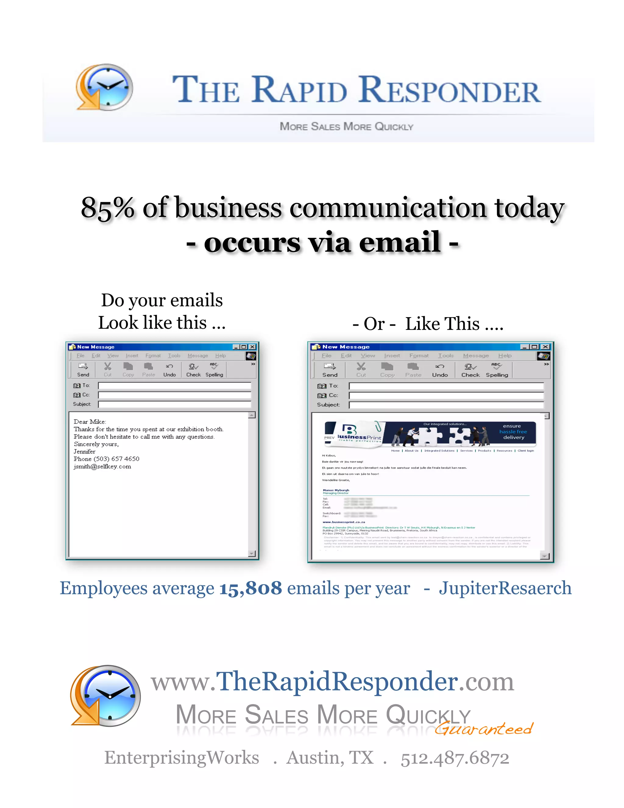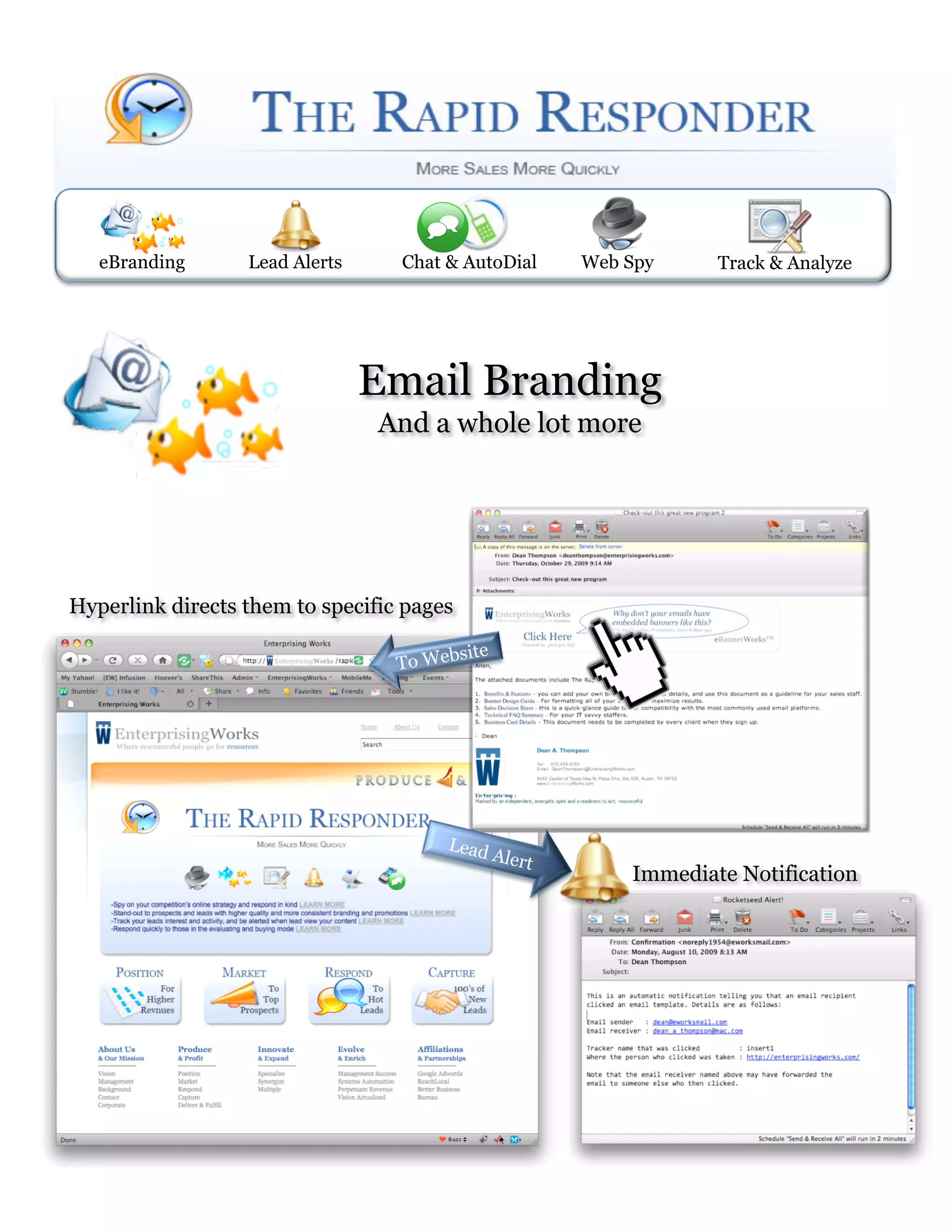 This document promotes the Rapid Responder service, which provides various digital marketing tools to help businesses improve email branding, track website visitors and leads, spy on competitors' strategies, and connect with potential customers. It emphasizes the importance of quickly responding to online leads and presents Rapid Responder's features like email branding, lead alerts, web spying, tracking and analyzing website traffic, chat and autodial functions. The goal is to help companies promote their brand, identify the best prospects, and outperform competitors through rapid response capabilities.