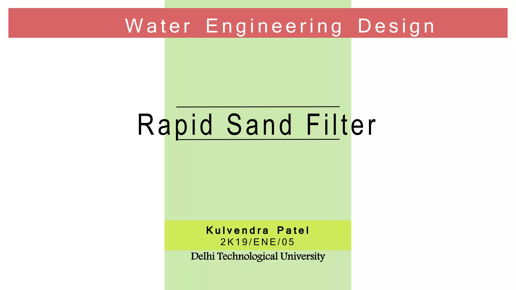 The document discusses the rapid sand filtration technique used for treating drinking water, detailing its operation, types, and essential features. It highlights the advantages and disadvantages, such as effective turbidity removal but limitations in reducing contaminants like bacteria and salts, necessitating pre- and post-treatment measures. Additionally, it emphasizes the need for skilled supervision and proper maintenance to manage the complex processes involved.