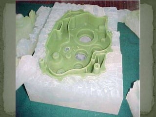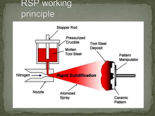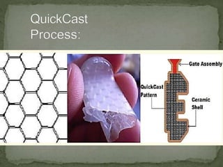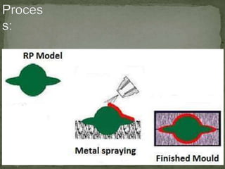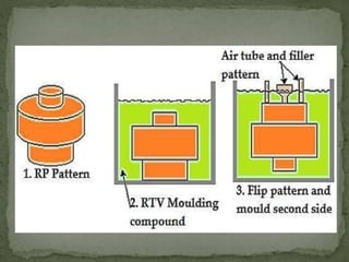 Rapid tooling uses rapid prototyping processes to quickly fabricate molds and tools for low to medium volume production of prototype parts. It can be classified as either indirect tooling, which uses an RP pattern to create a mold, or direct tooling, which builds the actual mold directly from a 3D CAD model. Indirect methods like silicone rubber tooling and spray metal tooling allow fabrication of molds in a fraction of the time and cost of conventional tooling but have shorter tool life. Direct methods like AIM and QuickCast SLA can produce metal parts in less time than traditional investment casting.