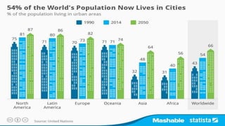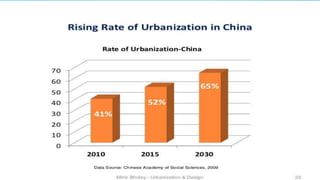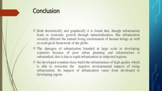 The document discusses urbanization around the world and compares the urbanization of China and India. It states that urbanization occurs as more people move from rural to urban areas, increasing the proportion living in cities. It provides data showing China and India both experienced rapid urbanization between 1950 and 2005, though China urbanized at a faster rate. Causes of urbanization mentioned include improving opportunities for work, education and transportation in cities. The document also notes effects of urbanization on natural resources like water, air, soil and energy sources, as well as on wildlife. It introduces the World Urban Forum, an international forum run by the UN since 2002 to address urban issues globally.