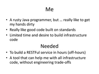 Roo is a productivity tool that allows for easy creation of Enterprise Java applications. It generates infrastructure code like entities, controllers, and services through simple shell commands. Roo uses AspectJ for automatic code generation and integrates with Spring technologies like dependency injection and MVC. It aims to help developers build RESTful services quickly without needing to write infrastructure code from scratch.