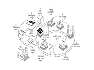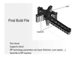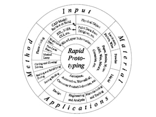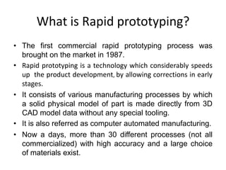 Rapid prototyping is a technology that builds physical 3D models directly from CAD data. It allows for faster product development by enabling corrections in early stages. The process involves slicing a 3D CAD model into layers, then depositing or solidifying materials layer-by-layer to build the model from the bottom up with no tooling required. Common rapid prototyping methods include stereolithography, fused deposition modeling, selective laser sintering, and 3D printing.