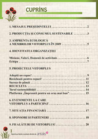 Raportul anual de activitate pentru anul 2009 al organizatiei non-profit ViitorPlus-asociatia pentru dezvoltare durabila. O parte din fotografiile folosite în acest material aparţin lui Mircea Ilie, Filip Adrian Nicolae şi www.efffectve.com