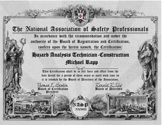 This document appears to be a resume for Michael Rapp for the position of Hazard Analysis Technician-Construction. It lists Michael Rapp as the applicant and July 5th, 2012 as the date. The resume does not provide any details about Michael Rapp's qualifications, experience, or education for the position.