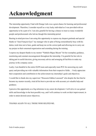 The document outlines the 'meetasap' project, an end-of-studies project focused on developing an innovative communication service leveraging RCS over 4G technology. It details the author's dedication and acknowledgments to family, colleagues, and mentors, and highlights the learning and professional development gained during an internship at Orange Labs. The project aims to enhance user experience by providing a reliable and comprehensive platform for communication and meeting arrangements.