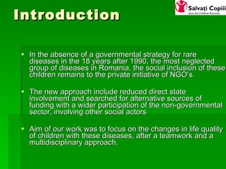 The document discusses the role of NGOs in educating patients with rare diseases and the general population in Romania. It describes how NGOs have filled a gap left by the lack of a governmental strategy for rare diseases. The NGOs worked with 32 children and young adults affected by 5 rare diseases, organizing a club for them. Through activities like games, trips, and celebrations together, the children were able to become more assertive and achieve developmental targets according to their parents. The conclusion is that the health and social integration of people with disabilities can be improved through opportunities for family, education, and friendship provided by community organizations like NGOs.