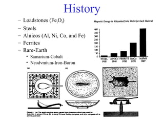 Rare earth magnets have evolved from loadstones and steels to modern alloys like samarium-cobalt and neodymium-iron-boron. They are made through processes like compressing alloy flakes or sintering powder under high heat. Rare earth elements make strong magnets through quantum effects that align electron spins into a magnetized crystal structure with high magnetic properties. These magnets find applications in technologies like MRI machines, sensors, motors, and audio devices.